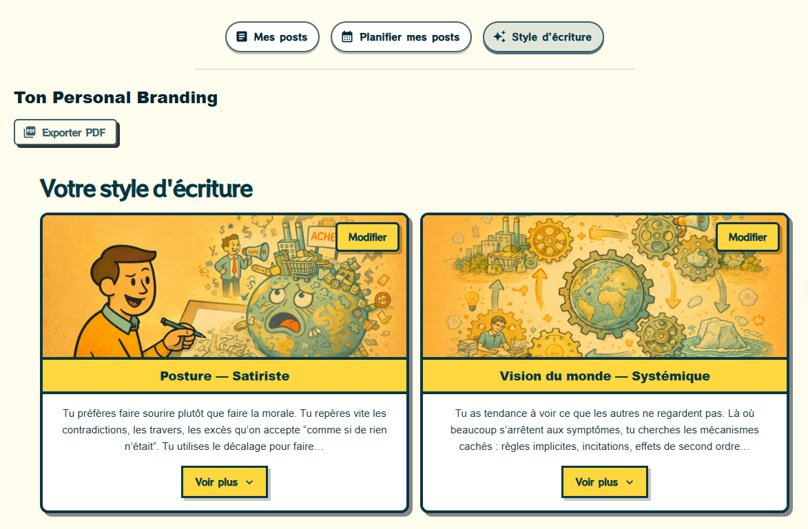 A partir de tes posts, notre IA fait emerger une vision claire et unique de ton expertise pour attirer les bons clients.