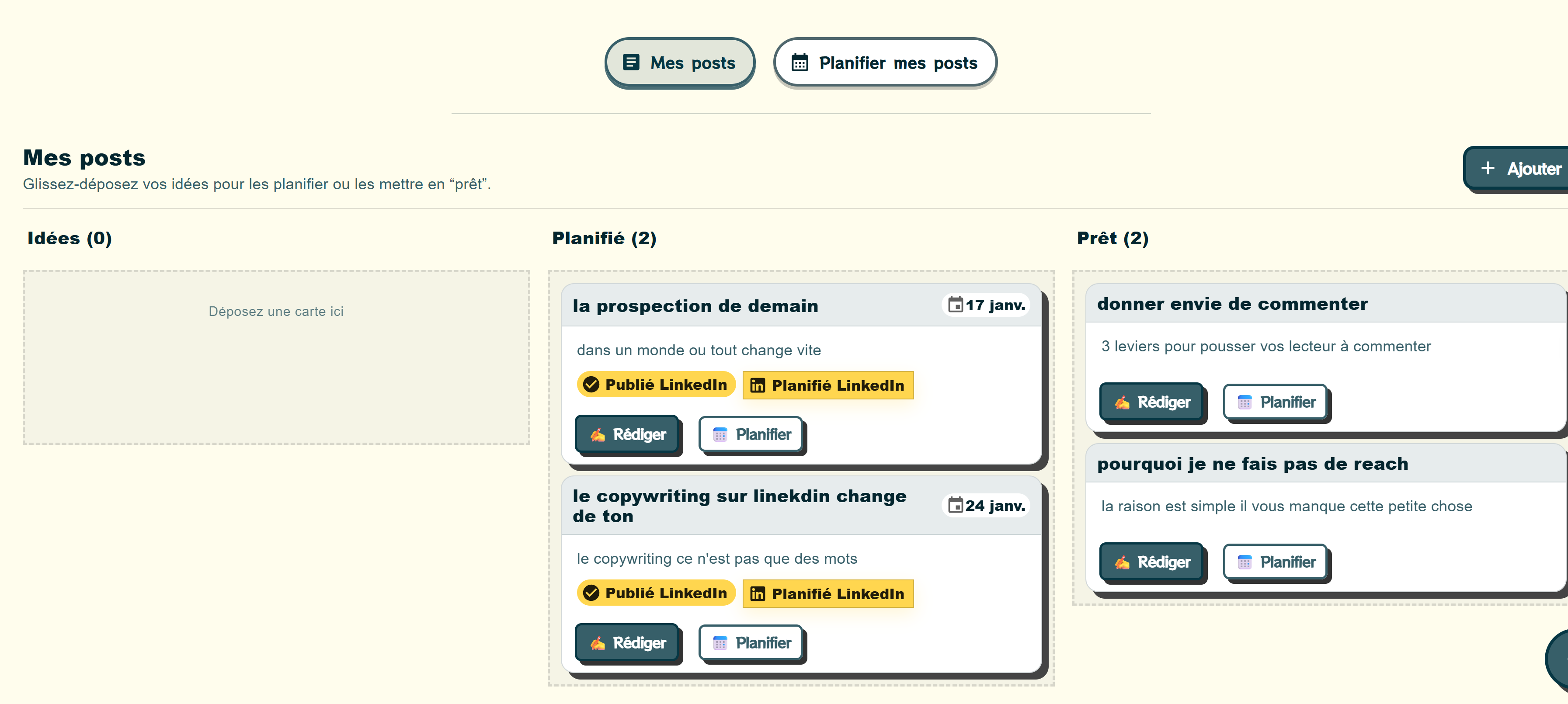 Un seul endroit pour transformer tes idees en posts, mesurer leur potentiel et les programmer.